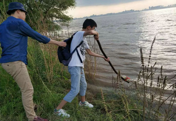 14日,实践队的老员工们根据昨天实际的考察情况,来到了长江边的取样地点。为了确保采水样过程的安全性,解决长江岸边可能存在的安全隐患,他们利用取点现场的长木棍,手动做了一个取水样的道具,使取水的过程更具有安全保证。